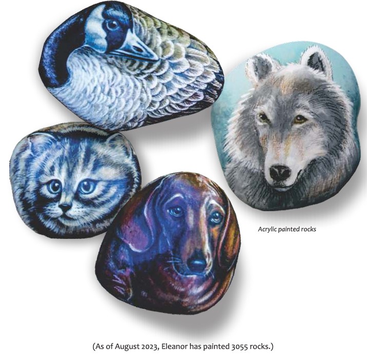 In addition to that work, Eleanor has produced many posters and decorations for church hall dinners, socials, and dedications. More recently she has illustrated child & adult books, book covers, murals for City of Windsor projects, as well as portraits and a logo for her church. Rock painting and felt center pieces are her latest creations. Beginning in the 1980's, to date she has completed over 3000 paintings on rocks and over 600 felt center pieces. With her brushes and artistic eye, Eleanor enjoyed capturing beauty in pets, flowers, & many of the Christian Saints.